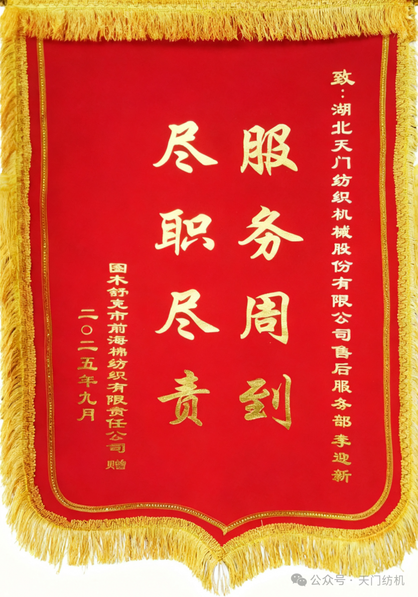 “服務(wù)周到,盡職盡責”,這是天門紡機新疆客戶圖木舒克市前海棉紡織有限責任公司送給90后售后服務(wù)工程師李迎新的錦旗贈言。短短八個字,既是肯定,又是褒揚。